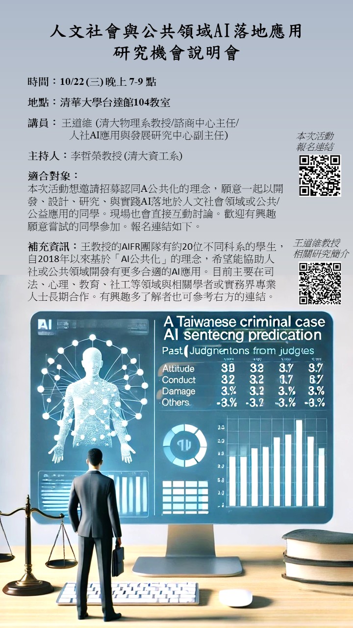 關於王道維教授的人社AI領域相關應用研究的簡介,可參考連結: https://wooo.tw/qTrXYe4